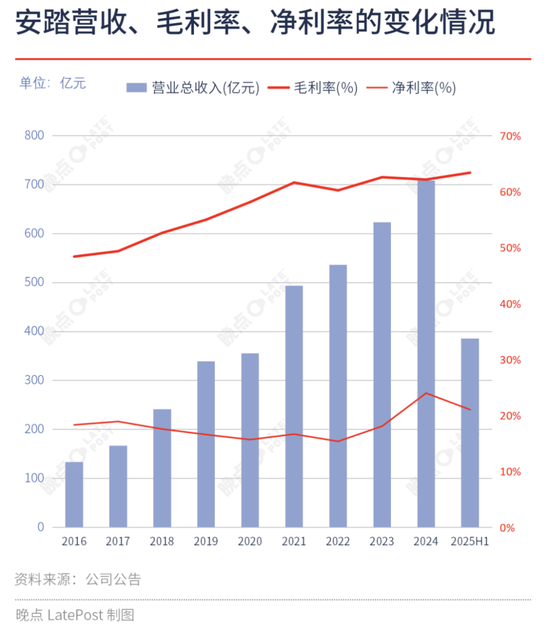 在各业务结构化表现中,2025 上半年安踏品牌和 FILA 品牌的收入规模分别为 169.5 亿元和 141.8 亿元,同比增长为 5.4% 和 8.6%;包括迪桑特、可隆在内的所有其他品牌收入为 74.1 亿元,增速达到 61.1%。